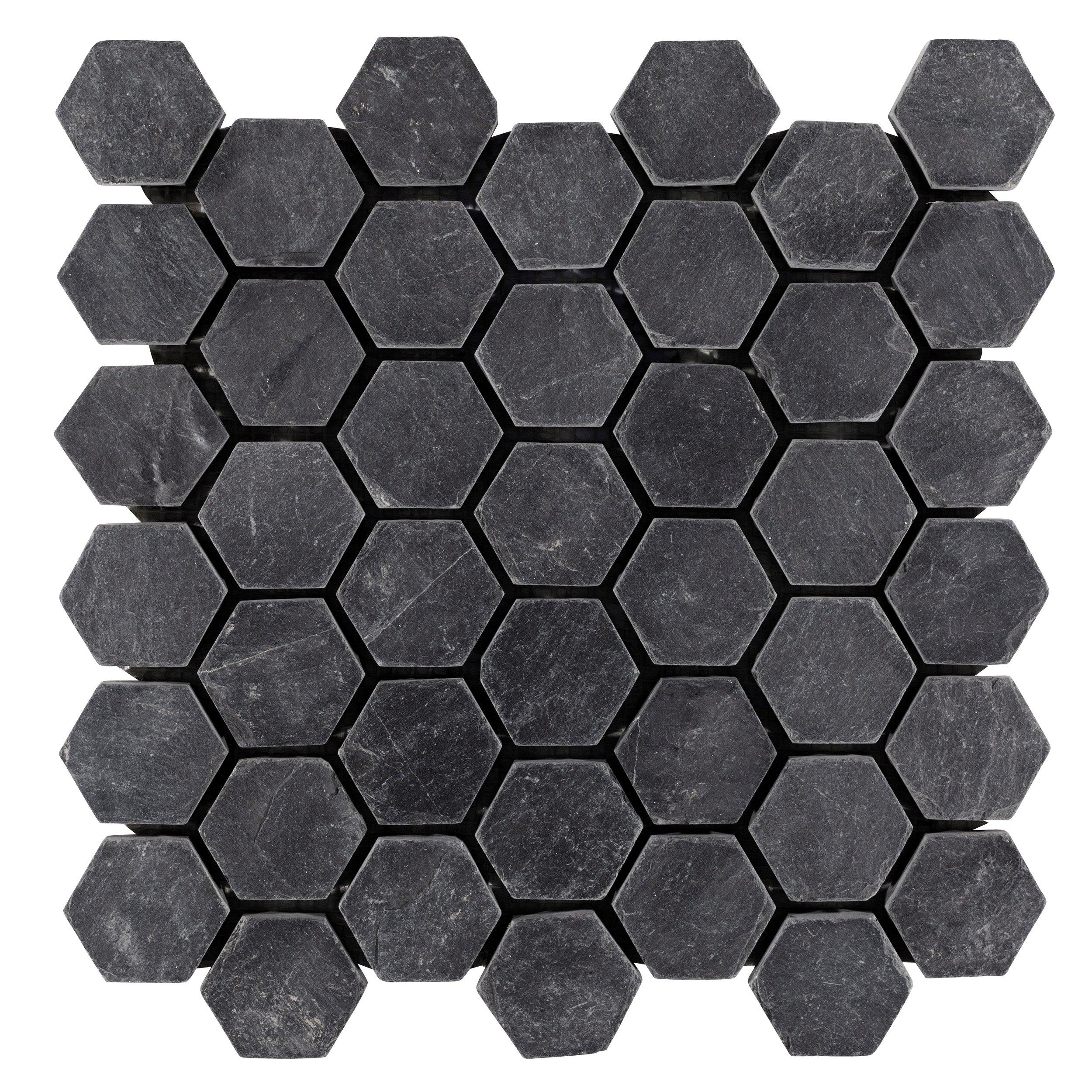 Black Hexagon Slate Mosaic | Floor and Decor Product Details Accent the look of your home with this 12 x 12 hexagon & octagon Black Hexagon Slate Mosaic. The black color gives a nice touch to any room. Hexagon & octagon-shaped stone decoratives create unique eye-catching designs. This stone decorative is made from slate.