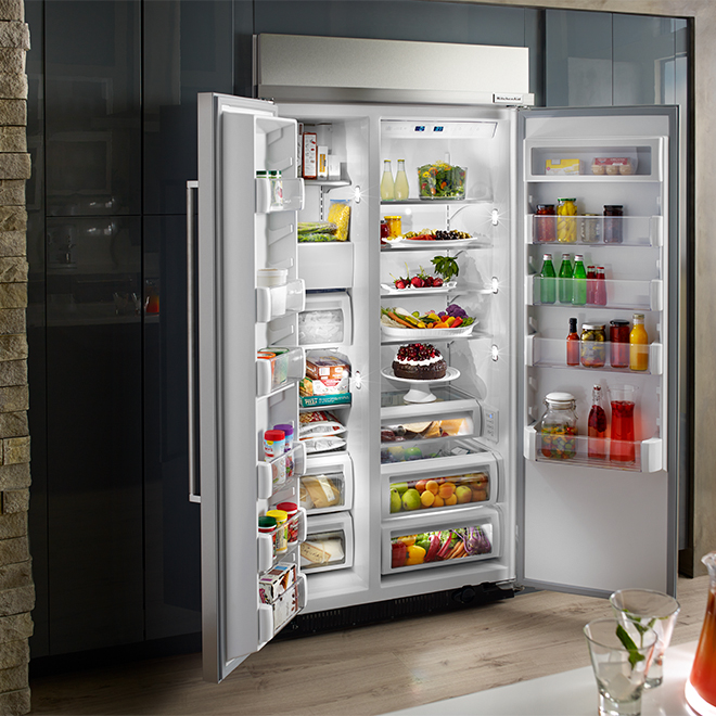 KitchenAid 48-in Built-In Side-by-Side Refrigerator with... | RONA The refrigerator is backed by the Fit system limited guarantee that ensures KitchenAid brand built-in refrigerator will replace your existing cabinet cut out of a standard comparable built-in refrigerator model that is 36, 42, or 48 inches wide or KitchenAid will provide up to $300 for a professional to...