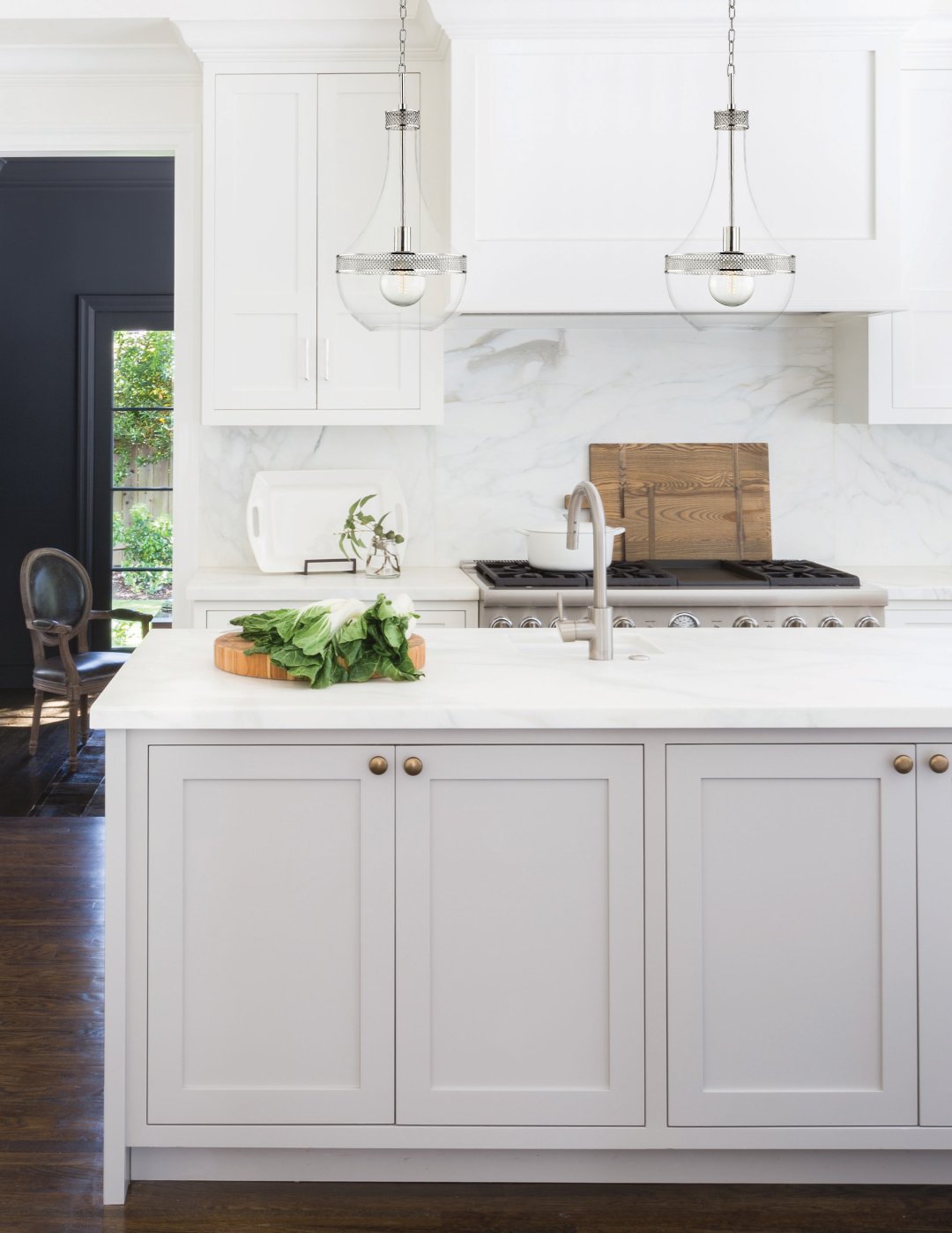 Kitchens Half Moon Table Design Ideas - DecorPad Large open black and white kitchen features a white marble top island with ornate turned legs, black leather half moon backless counter stools, illuminated by black metal and glass gothic lanterns. Hendel Homes Chic kitchen boasts white cabinets paired with white quartz countertops and a linear marble tiled backsplash. Carrier and Company