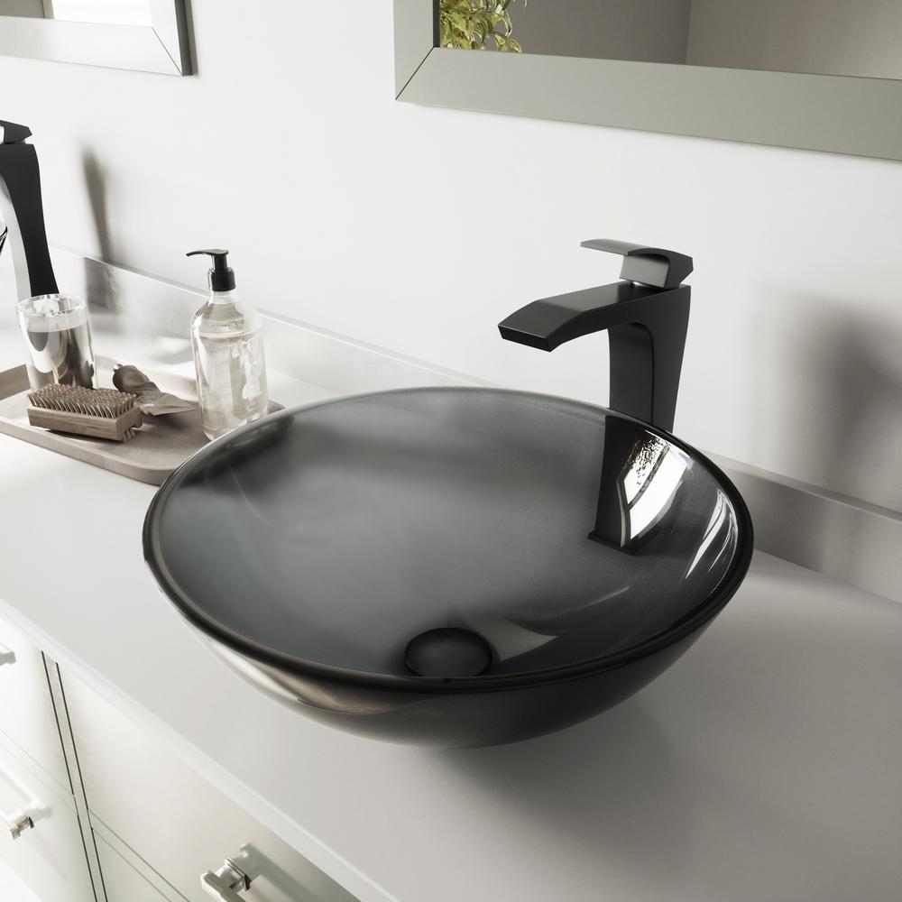 VIGO Glass Vessel Bathroom Sink in Sheer Black and Blackstonian Faucet Set in Matte Black-VGT461 ...
