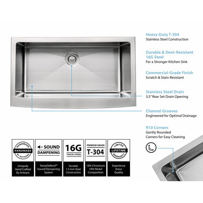 KRAUS 30 Inch Farmhouse Single Bowl Stainless Steel Kitchen Sink with ... Handcrafted from premium 16 gauge T-304 stainless steel for maximum durability, the farmhouse sink creates a contemporary look for the kitchen. Extra-deep basins accommodate large dishes with ease. The clean lines and apron front design complement any décor, from traditional to transitional to modern.