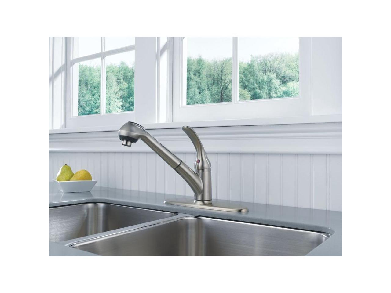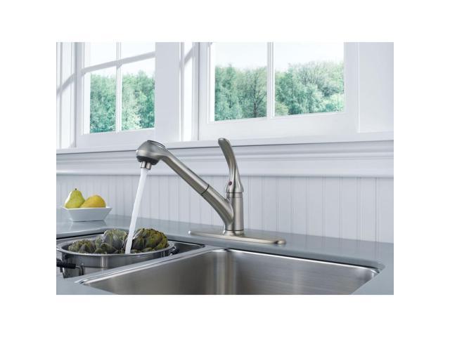 Delta Faucet B4310LF-SS Foundations Single Handle Pull-Out ... This Delta Faucet B4310LF-SS Foundations Single Handle Kitchen Faucet with Pull-Out Sprayer in Stainless provides a practical, hardworking solution that will stand the test of time, every time. This Kitchen Faucet is perfect for homes that have contemporary or modern decor. This kitchen faucet is made from premium-quality materials, and this ...
