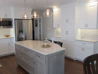 Kitchen Remodel Lancaster, PA Cabinet: Waypoint 610D. Perimeter: Painted Linen; Island: Stained Espresso; Hardware: Richelieu 388838-FB; Flooring: LVT Mannington Adura San Luca Sand Castle 18X18