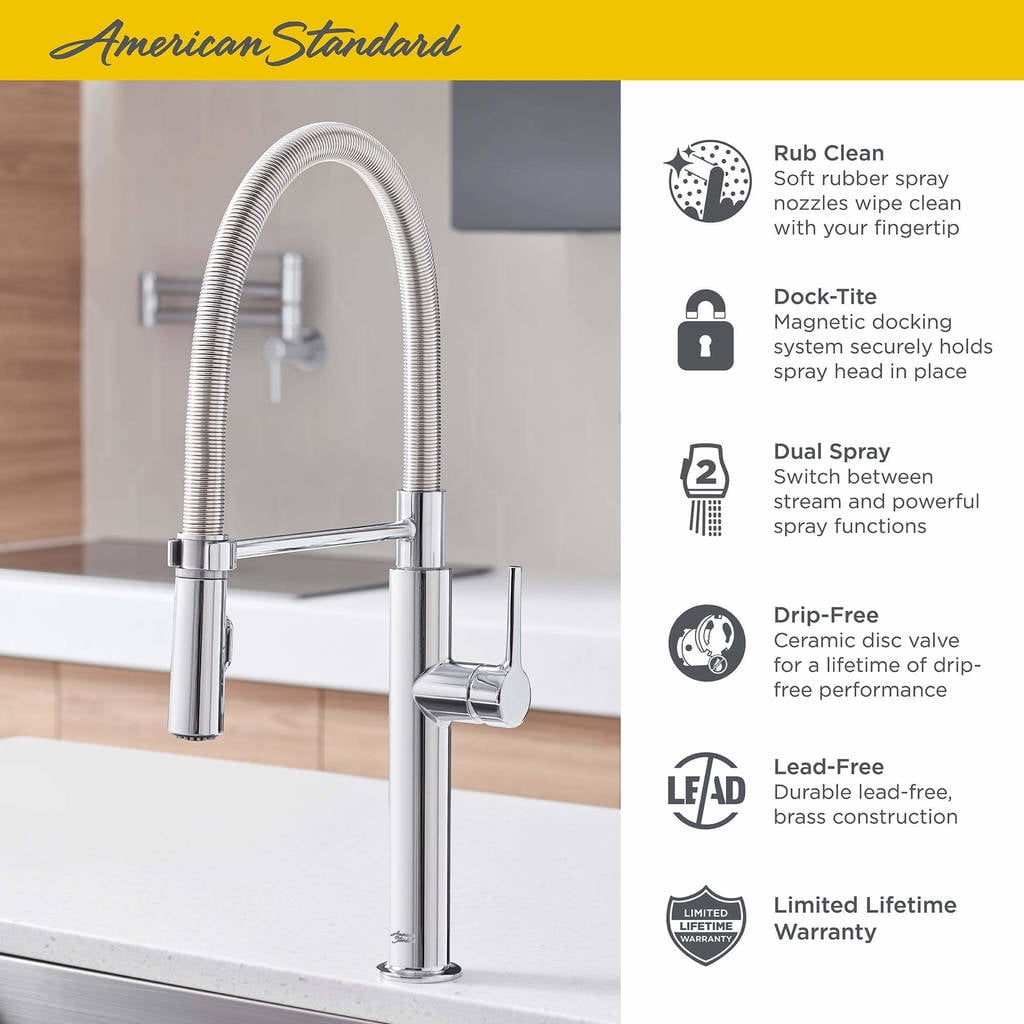 Studio® S Semi-Pro Pull-Down Dual Spray Kitchen Faucet With Spring Spout More than a professional look, the Studio S Semi Pro Dual-Spray Kitchen Faucet with Spring Spout from American Standard combines commercial-inspired design thoughtfully engineered for today's home. Contemporary cylinder base with raised, one-piece lever handle and flexible stainless steel coil lends an impressive gourmet touch. Allowing easy maneuverability and ample room for filling large ...