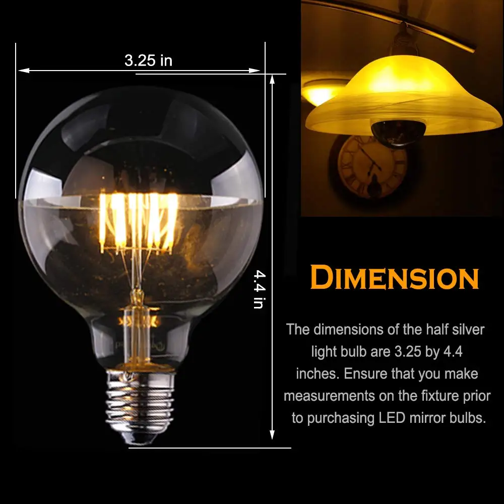 G95 8W LED Bulb E26 120V Mirror Half Tipped Chrome Globe silver 2700K Warm Light Edison Retro Shadowless Lamps