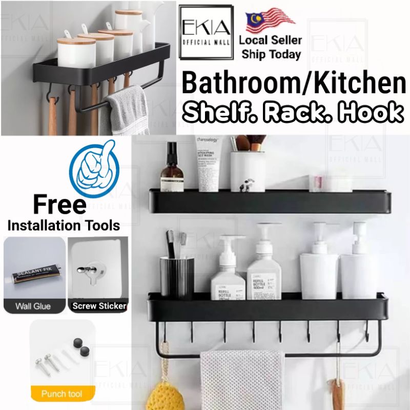 NEWð¥ Bathroom Storage Shelf Kitchen Rack with Hook Towel Bar Toilet Wall Shelf Drain Shelf Kitchen Storage